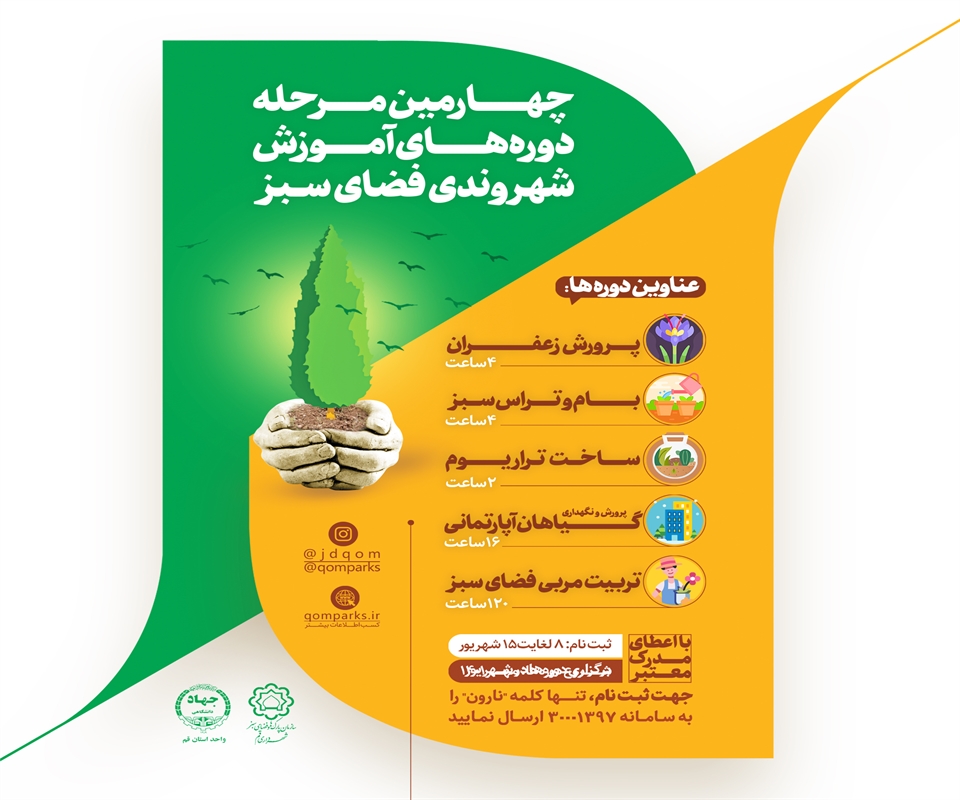 مدیر عامل سازمان پارک ها و فضای سبز شهرداری قم با اشاره به برگزاری چهارمین مرحله دوره های آموزش شهروندی فضای سبز اظهار داشت: زمان ثبت نام در این دوره ها از هشتم آغاز و تا ۱۵ شهریورماه ادامه دارد.