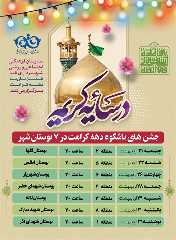 سلسله جشنهای دهه کرامت با عنوان "در سایه کریمه" در ۷ بوستان سطح شهری به همت سازمان فرهنگی اجتماعی ورزشی شهرداری قم برگزار میشود.