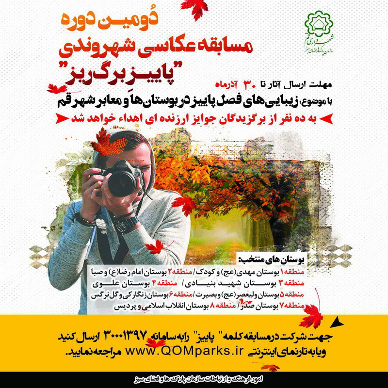 در سال گذشته اولین دوره از مسابقه عکاسی شهروندی "پاییز برگریز" باهدف به تصویر کشیدن زیباییهای فصل پاییز در بوستانها و معابر شهری شهر کریمه اهل بیت(س) برگزار شد و امسال نیز دومین دوره از این مسابقه با شرایط زیر برگزار خواهد شد.