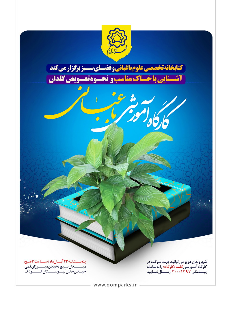 قابلذکر است این کارگاه آموزشی روز پنجشنبه 23 آبان ماه ساعت 11 صبح در مرکز ارتباطات مردمی و کتابخانه تخصصی علوم باغبانی و فضای سبز واقع در میدان بسیج خیابان میرزای قمی، خیابان جنان/ بوستان کودک برگزار میشود.