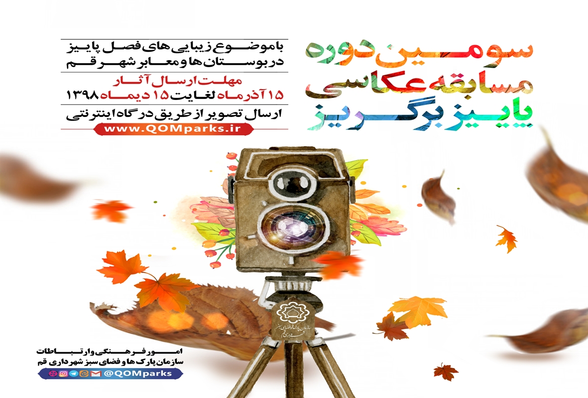 مختاری افزود: مهلت ارسال آثار جهت شرکت در سومین دوره مسابقه شهروندی «پاییز برگ‌ریز» تا 15 دی‌ماه علاقه‌مندان می‌توانند جهت اطلاع از شرایط، مشاهده فراخوان و ارسال آثار به درگاه اینترنتی سازمان به نشانی www.QOMparks.ir مراجعه نمایند.